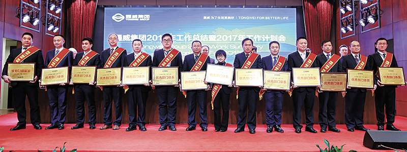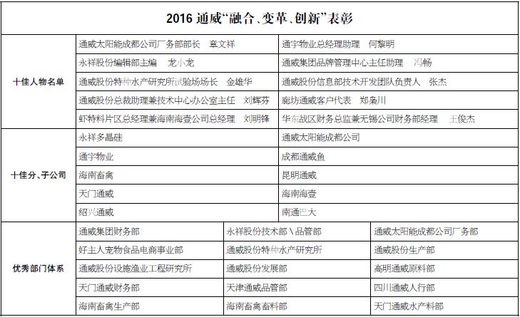 在2016年工作總結(jié)暨2017年工作計劃會上,經(jīng)通威集團(tuán)總裁辦、通威股份總裁辦及各部門嚴(yán)格評選,劉主席最終批示,隆重評選出了符合集團(tuán)品牌高度、形象定位、管理要求、文化引領(lǐng)的優(yōu)秀分、子公司、優(yōu)秀部門體系及先進(jìn)人物,并授予2016通威“融合、變革、創(chuàng)新”十佳分、子公司、優(yōu)秀部門體系和十佳人物榮譽(yù)稱號,以表彰他們在集團(tuán)品牌傳播與企業(yè)文化建設(shè)方面的卓越貢獻(xiàn)。