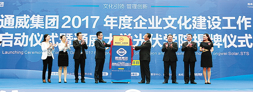 啟動儀式上,通威股份企業(yè)文化建設(shè)工作執(zhí)行小組組長、通威股份傳播策劃部部長馮暢代表企業(yè)文化建設(shè)專項工作小組進行工作成果及規(guī)劃匯報。匯報中指出,過去幾年,企業(yè)文化建設(shè)與傳播工作成為集團各板塊日常經(jīng)營管理工作的指導(dǎo)和重點。2017年,集團企業(yè)文化工作將圍繞“講用匯談”、“六度學(xué)習(xí)”征文活動、“我與通威”朗誦比賽三大主線開展,獻禮集團35周年華誕。當(dāng)天儀式上,劉漢元主席等領(lǐng)導(dǎo)共同為通威大學(xué)光伏學(xué)院揭牌。“通威大學(xué)光伏學(xué)院”將在未來3年內(nèi),著力打造通威光伏學(xué)院成為全國一流的企業(yè)大學(xué),成為通威農(nóng)業(yè)+光伏雙輪驅(qū)動發(fā)展的“源動力”。
