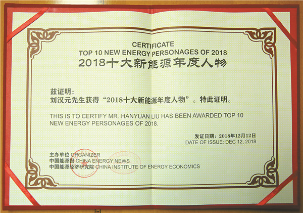 “2018 中國(guó)十大新能源年度人物”榮譽(yù)證書(shū)