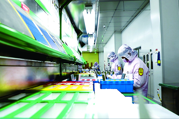 復(fù)工第一天的通威太陽能生產(chǎn)車間,在 充分防疫措施保障下,各項(xiàng)工作有序開展