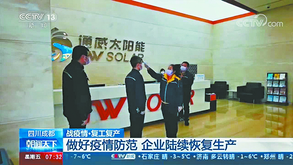 央視新聞《共同戰(zhàn)“疫”》特別欄目記者走進(jìn)通威太陽能成都基地,以“看成都企業(yè)恢復(fù)生產(chǎn)后如何嚴(yán)格防疫”為主題,聚焦通威太陽能新型冠狀病毒疫情防控工作,點(diǎn)贊公司戰(zhàn)疫情、保生產(chǎn)相關(guān)舉措。