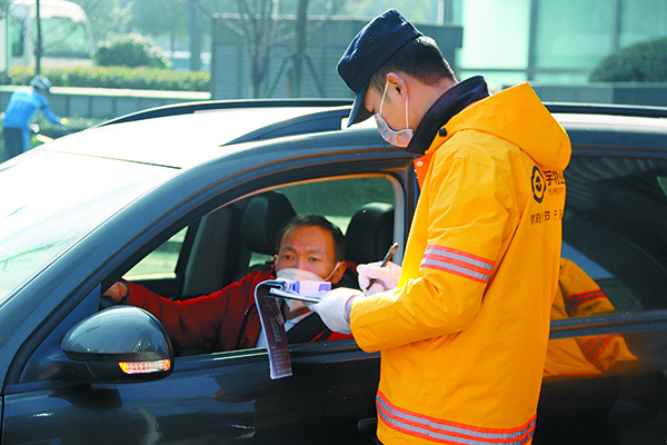 通宇物業(yè)工作人員在車輛入口登記并測量體溫