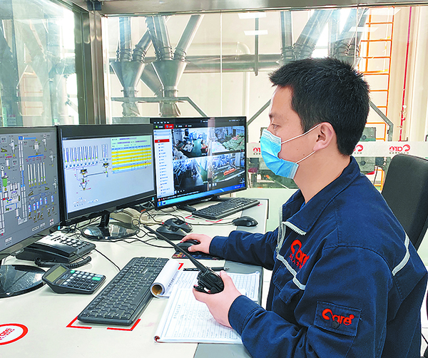為了不影響中控工作的正常開展,同時完成好每日防控消毒工作,每天早上7點,黃小東便開始了自己一天的工作。他按照公司防控要求將自己所負責(zé)的區(qū)域消毒并完成記錄后,又立即放下噴灑設(shè)備,趕到發(fā)貨區(qū)前同大家一起開晨會,然后再回到原本的中控崗位。在確認今天生產(chǎn)計劃任務(wù)后,他又使用對講機與各工段組長溝通開機前的各項生產(chǎn)準(zhǔn)備工作。