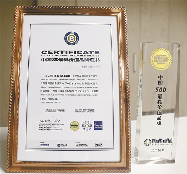 8月5日,由世界品牌實驗室主辦的2020年第十七屆世界品牌大會在北京舉行。通威品牌價值正式突破1000億元大關,達1002.67億元,創下歷史新高,成為全球水產和光伏兩大行業首個品牌價值破千億的企業!通威榮列2020年《中國500最具價值品牌》百強排行榜,位列53位。