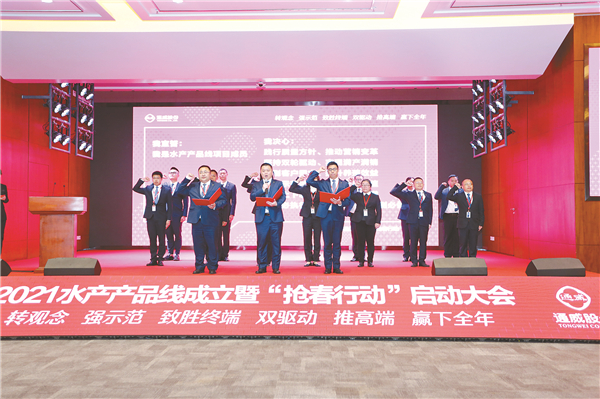鷹擊長空,魚翔淺底。2月18日開工以來,遵照劉漢元主席“聚焦聚勢、揚長砍短、執(zhí)行到位、高效經(jīng)營”的指示,通威股份召開水產(chǎn)產(chǎn)品線成立暨搶春行動啟動大會,三大產(chǎn)品線全面啟動。同時各戰(zhàn)區(qū)、各分子公司相繼召開迎戰(zhàn)2021誓師大會,向2021年全新市場目標(biāo)發(fā)起沖刺。
