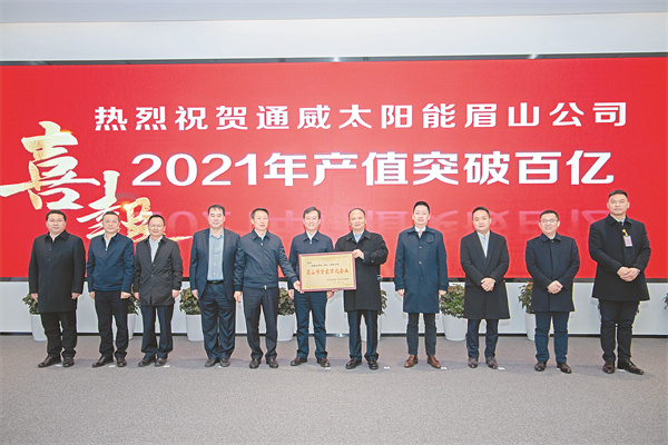 2021年,通威太陽(yáng)能眉山公司實(shí)現(xiàn)產(chǎn)值101億元,成為眉山市第一家百億企業(yè)。1月25日,通威太陽(yáng)能眉山公司成為眉山市首家百億企業(yè)授牌儀式在眉山基地展廳隆重舉行。眉山市委書記胡元坤,通威集團(tuán)董事局劉漢元主席出席授牌儀式。市委副書記、市長(zhǎng)黃河主持儀式。授牌儀式上,黃河市長(zhǎng)指出,眉山市委市政府提出“制造強(qiáng)市、開放興市、品質(zhì)立市”,傾力打造“1+3”現(xiàn)代工業(yè)體系。通威太陽(yáng)能作為全球光伏行業(yè)領(lǐng)軍企業(yè),自2019年3月落戶眉山以來(lái),從談判、簽約到投產(chǎn),創(chuàng)造了“通威速度、眉山速度”。從2020年4月投產(chǎn)至今,不到兩年的時(shí)間,2021年便實(shí)現(xiàn)了產(chǎn)值超100億元,再次創(chuàng)造了“通威速度”,成為全市首個(gè)產(chǎn)值突破百億的企業(yè)。我們向漢元主席及漢元主席領(lǐng)導(dǎo)的通威集團(tuán)表示熱烈的祝賀,并對(duì)通威太陽(yáng)能在眉山工業(yè)經(jīng)濟(jì)發(fā)展中作出的貢獻(xiàn)表示衷心的感謝。