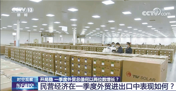 4月13日,央視《新聞聯播》播出“一季度我國外貿開局平穩”報道,央視記者赴通威太陽能金堂基地現場采訪,實地了解企業外貿出口情況。同日,央視《東方時空》在報道“我國民營經濟一季度發展情況”時,也聚焦了通威太陽能。截至目前為止,今年央視已經4次聚焦通威新能源產業發展成果和創新實力,展示了通威為代表的中國光伏企業強勁的發展實力。