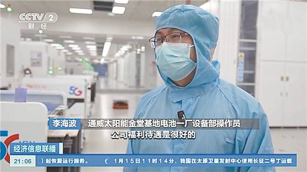 1月15日,央視財經頻道《經濟信息聯播》以“四川成都:光伏企業趕工期 漲薪補貼待遇留人”為題,聚焦通威太陽能員工春節留崗補貼及福利保障,點贊公司“以人為本”的企業關懷。