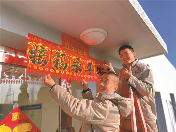 通威朝陽光伏電站運維工作員工貼春聯迎新春