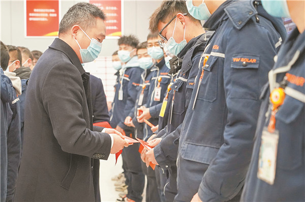 1月21日除夕夜,在永祥新能源廠區,通威股份副總裁、永祥股份總經理、永祥新能源總經理李斌向值守員工送上春節祝福和暖心禮物,感謝大家為公司發展所做出的努力。李總表示,新春佳節,大家不能與家人團聚,選擇了和公司在一起,展現了“舍小家,顧大家”的永祥精神。希望大家值班期間,要做到“我的崗位我負責,我的工作請放心”,用實際行動為公司安全穩定生產保駕護航。