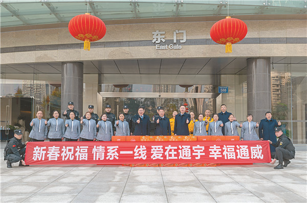 同日,通威集團副總裁黃其剛率通宇物業總經辦團隊來到通威國際中心,親切慰問節日期間堅守崗位的秩序部、環境部、工程部等三十余名一線員工。黃總特別轉達了劉漢元主席對大家的暖心問候,并發放了新春禮包,向堅守崗位的員工致以新春祝福和節日問候。期間,黃總查看了通威國際中心值守情況,仔細詢問了值守人員的崗位工作、食宿安排等情況,對大家井然有序地推進值班工作給予了充分肯定,并鼓勵大家值守期間,加強安全排查和設施維護,確保平安過節。