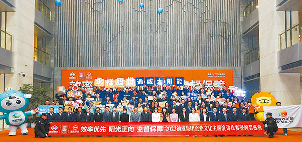 2023年12月22日,“效率優先 陽光正向 監督保障”2023通威集團企業文化主題演講比賽暨頒獎盛典在通威國際中心隆重舉行。盛典現場,來自通威各板塊、各分子公司的18位演講選手作精彩主題演講,講述著自己或身邊榜樣的陽光故事,傳遞著通威文化正能量。作為2023年企業文化亮點活動,當天還頒發了“2023年度通威集團企業文化建設示范基地”。