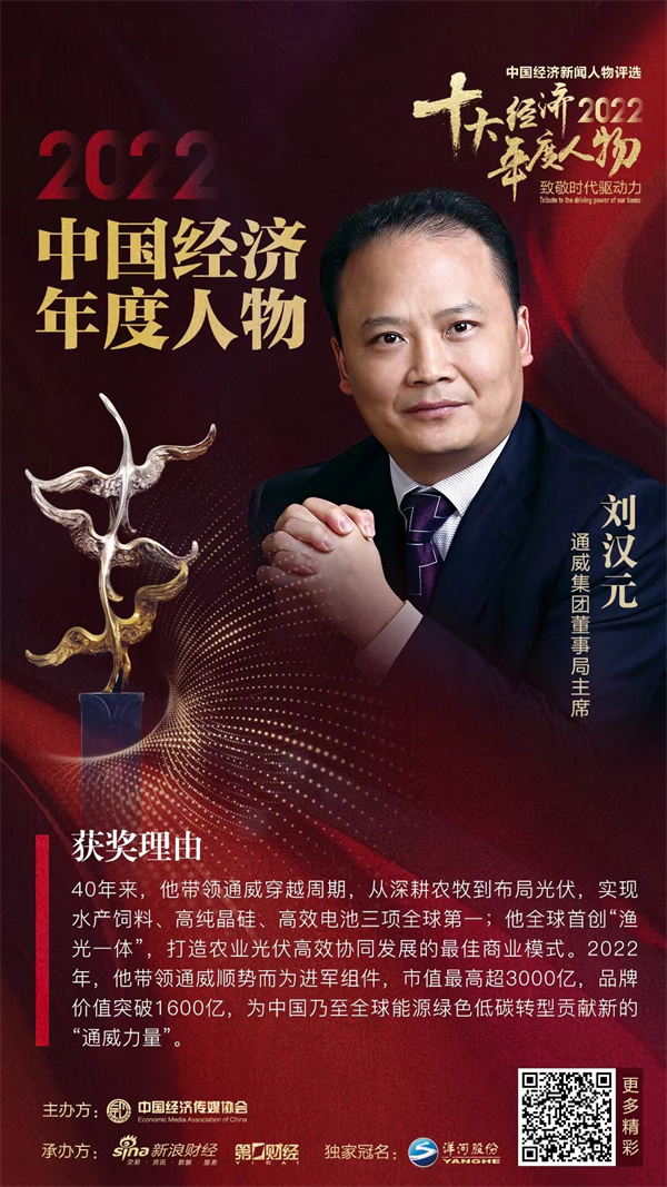 1月6日,被譽(yù)為中國經(jīng)濟(jì)奧斯卡大獎的“中國夢杯?中國經(jīng)濟(jì)新聞人物——2022十大經(jīng)濟(jì)年度人物”頒獎盛典在北京舉辦。全國人大代表、全國工商聯(lián)副主席、通威集團(tuán)董事局劉漢元主席榮膺“2022中國經(jīng)濟(jì)年度人物”。全國工商聯(lián)原副主席、農(nóng)業(yè)農(nóng)村部原副部長齊景發(fā),英才元投資董事長宋立新為劉漢元主席頒獎。