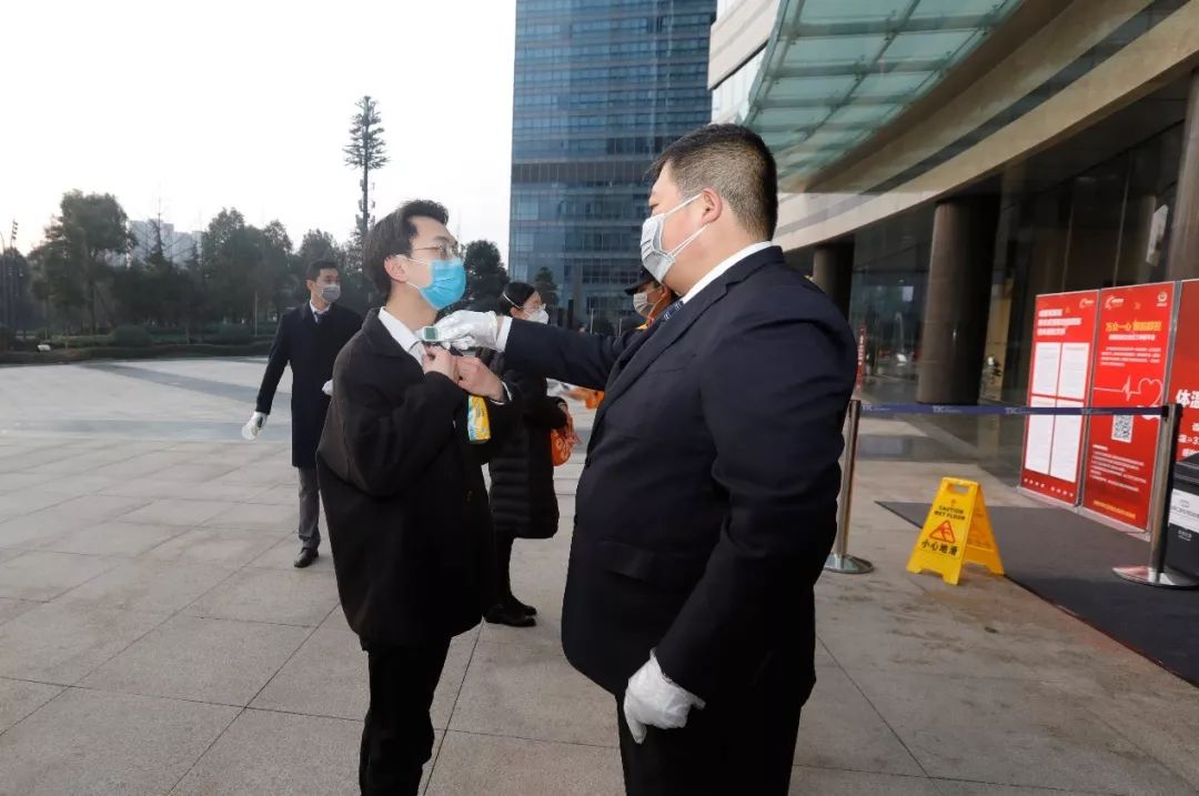 復工當天,通威國際中心所有進出口均鋪設了消毒地毯,對進出人員、車輛進行底部消毒;通宇物業(yè)工作人員在車輛入口登記、測量體溫,發(fā)放防疫抗疫溫馨提示,并提醒進出大樓必須佩戴口罩;所有人員由東門統(tǒng)一進入,工作人員通過查驗通行證、對手部噴灑消毒液、測量體溫等流程,對人員進行嚴格的防控檢查;大樓外圍、總部大堂、電梯、辦公區(qū)、餐廳區(qū)域等公共空間及用餐工具進行了全面消毒,并在大樓電梯固定專人消毒;為保證舒適清潔的空氣環(huán)境,大樓空調(diào)系統(tǒng)進行了相應調(diào)節(jié),電梯轎廂空調(diào)只開啟送風模式,在防疫的同時保持工作區(qū)域溫度;早餐時間,員工依次排隊在餐廳領取,并攜帶回工位就餐,午餐由餐廳工作人員統(tǒng)一配送至各樓層,在各自工位就餐。在保障大樓員工身體健康的同時,桂溪街道辦、天華社區(qū)和物業(yè)人員還對通威國際中心的入駐企業(yè)進行了走訪調(diào)查,詳細了解各單位復工人員身體狀況和相關防疫措施,杜絕交叉感染的可能性。