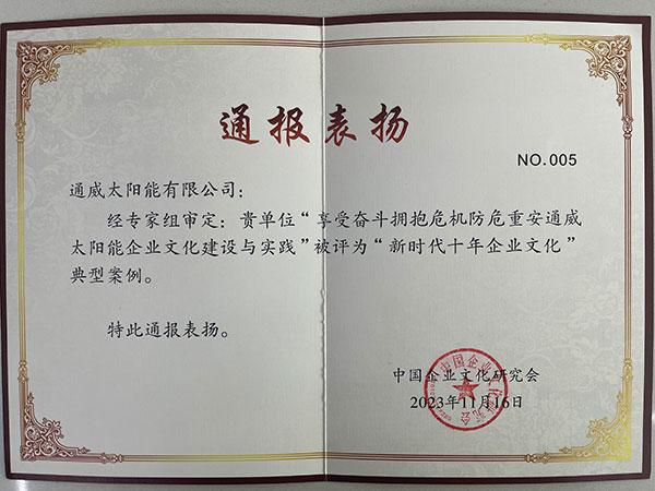 本次獲獎(jiǎng)是對(duì)通威太陽(yáng)能十年企業(yè)文化建設(shè)實(shí)踐和成果的充分肯定。新時(shí)代十年是通威太陽(yáng)能企業(yè)文化繁榮發(fā)展的十年,是企業(yè)文化為企業(yè)強(qiáng)基賦能的十年,也是通威太陽(yáng)能文化自覺(jué)文化自信迅速提升的十年。未來(lái),通威太陽(yáng)能將再接再厲,努力奮斗,通過(guò)文化強(qiáng)企進(jìn)而助力文化強(qiáng)國(guó),更好建設(shè)中華民族現(xiàn)代文明。