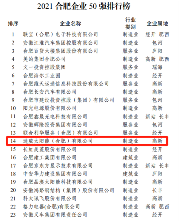 通威太陽能合肥基地榮列2021合肥企業50強、合肥制造業企業30強、合肥全國行業領軍企業榜單