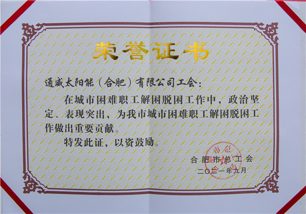 通威太陽能合肥基地工會榮獲“合肥市城市困難職工解困脫困工作中做出重要貢獻的集體”稱號