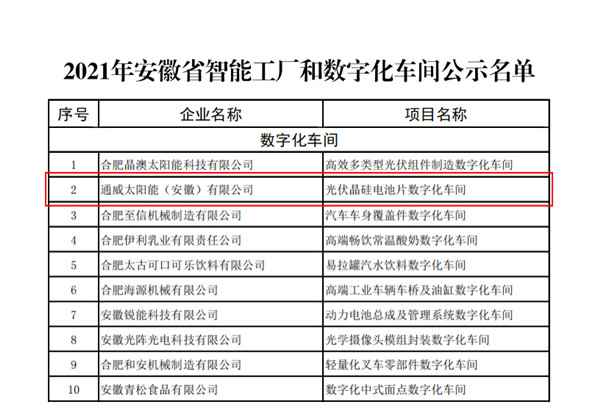 通威太陽能合肥基地榮獲“安徽省數(shù)字化車間”稱號