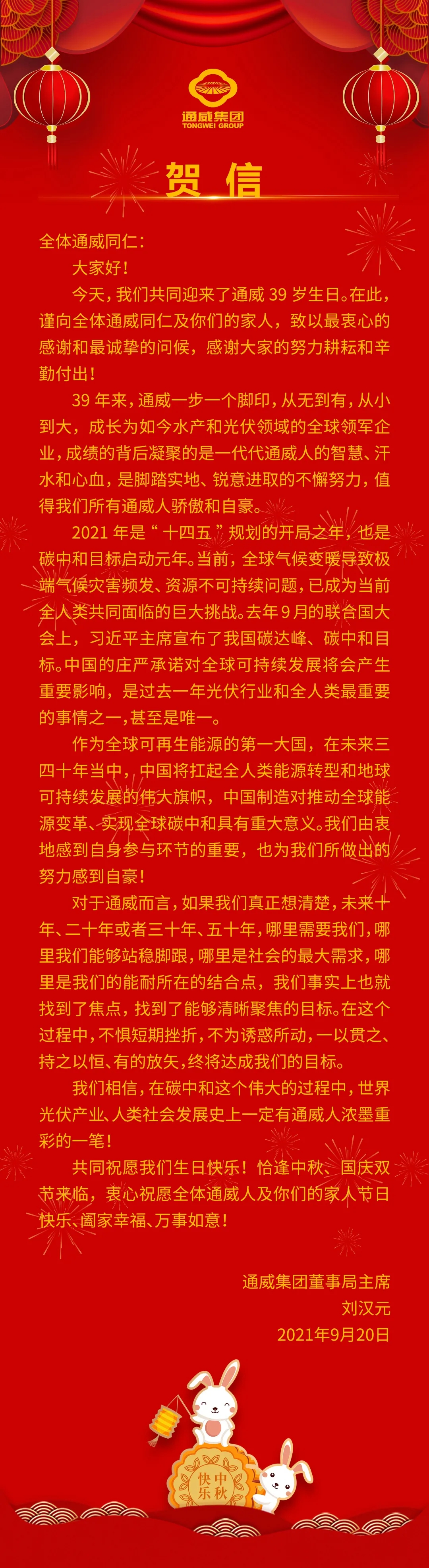 通威39年華誕丨劉漢元主席致全體通威人的賀信