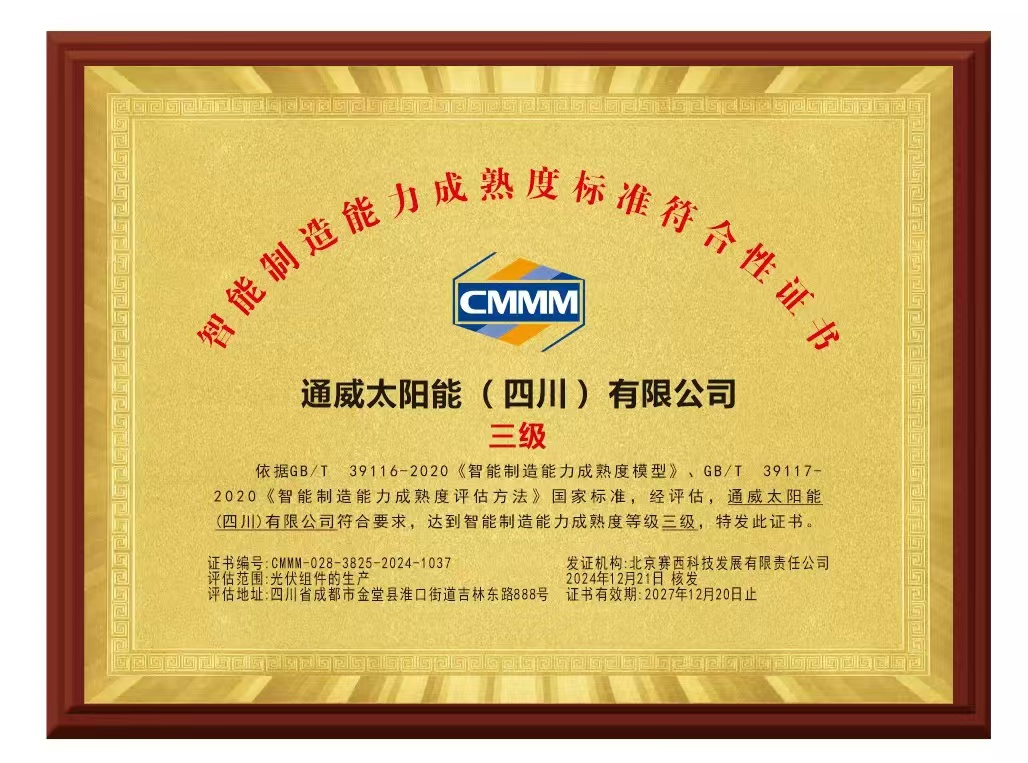 通威太陽能(四川)有限公司榮獲智能制造能力成熟度三級證書