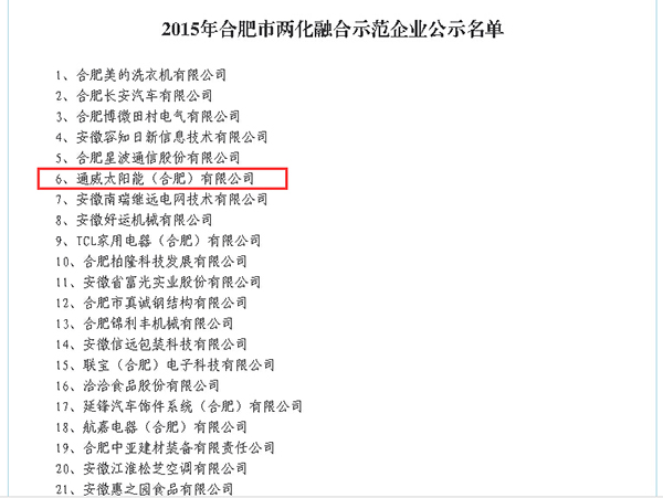 通威太陽(yáng)能(合肥)公司獲“2015合肥市兩化融合示范企業(yè)”稱號(hào)