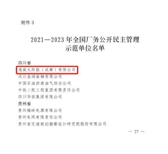 通威太陽能(成都)有限公司榮獲“全國(guó)廠務(wù)公開民主管理示范單位”