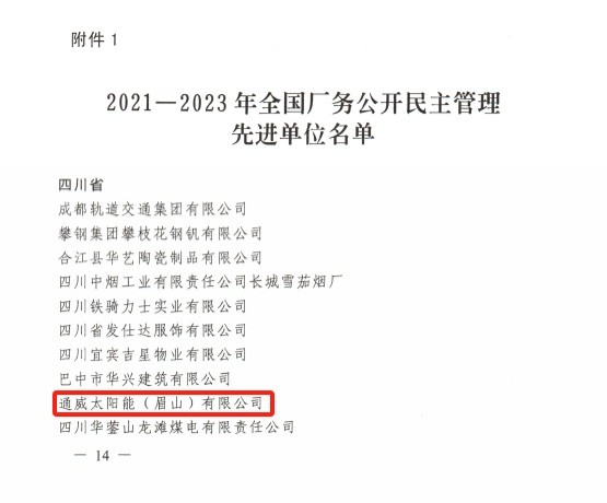 通威太陽能(眉山)有限公司獲評(píng)“全國(guó)廠務(wù)公開民主管理先進(jìn)單位”