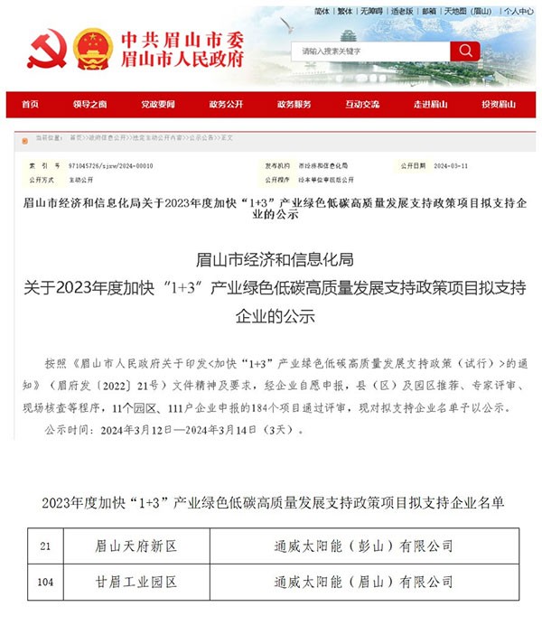 通威太陽能眉山基地、彭山基地雙雙榮獲眉山市“1+3”產業高質量發展政策支持
