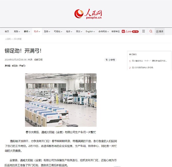 人民網、《四川日報》聚焦通威太陽能眉山基地龍年“開門紅”