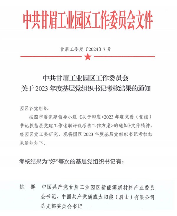 通威太陽能眉山基地黨總支書記姚騫被甘眉工業園區黨委評為“2023年度優秀基層黨組織書記”