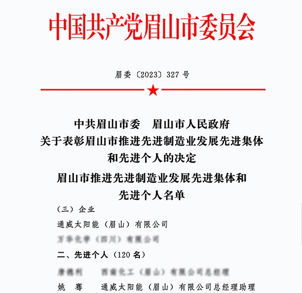 通威太陽能眉山基地及黨總支書記姚騫分別榮獲“眉山市推進先進制造業(yè)發(fā)展先進集體、先進個人”稱號
