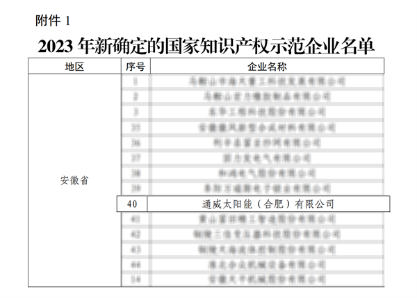 通威太陽能(合肥)有限公司獲評2023年國家知識產(chǎn)權(quán)示范企業(yè)