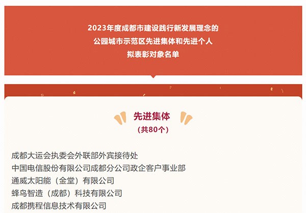 通威太陽能金堂基地榮獲“2023年成都市建設踐行新發展理念的公園城市示范區先進集體”