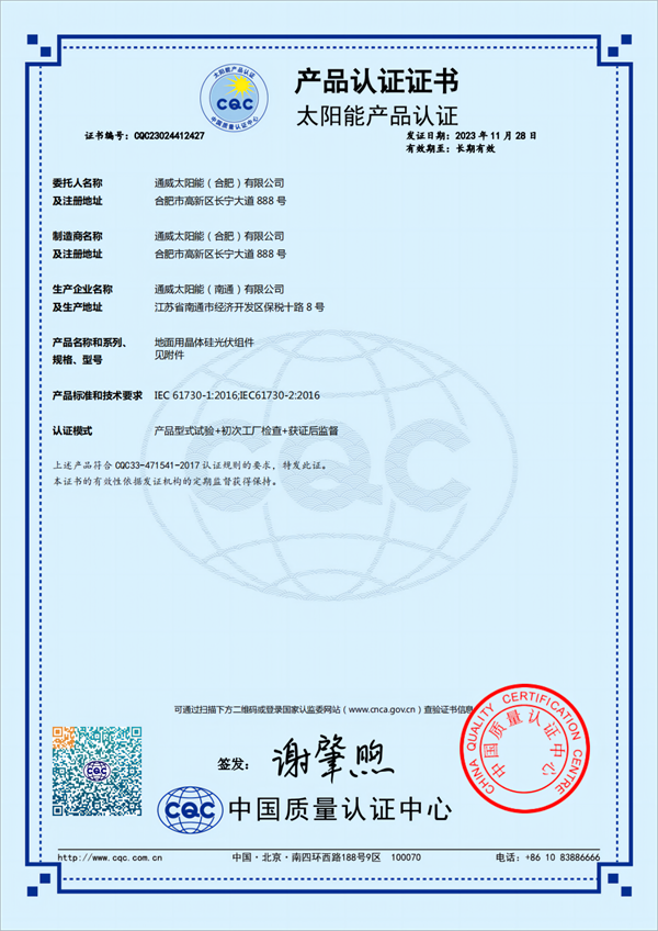 通威太陽能(組件)南通基地榮獲中國(guó)質(zhì)量認(rèn)證中心(CQC)產(chǎn)品認(rèn)證證書