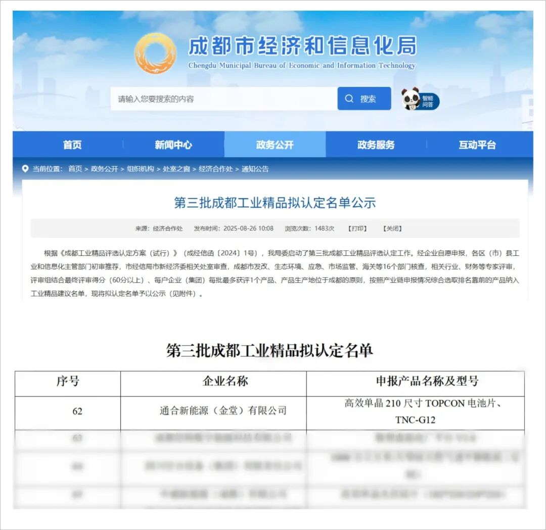 通合新能源(金堂)有限公司 榮列“第三批成都工業(yè)精品”認定名單