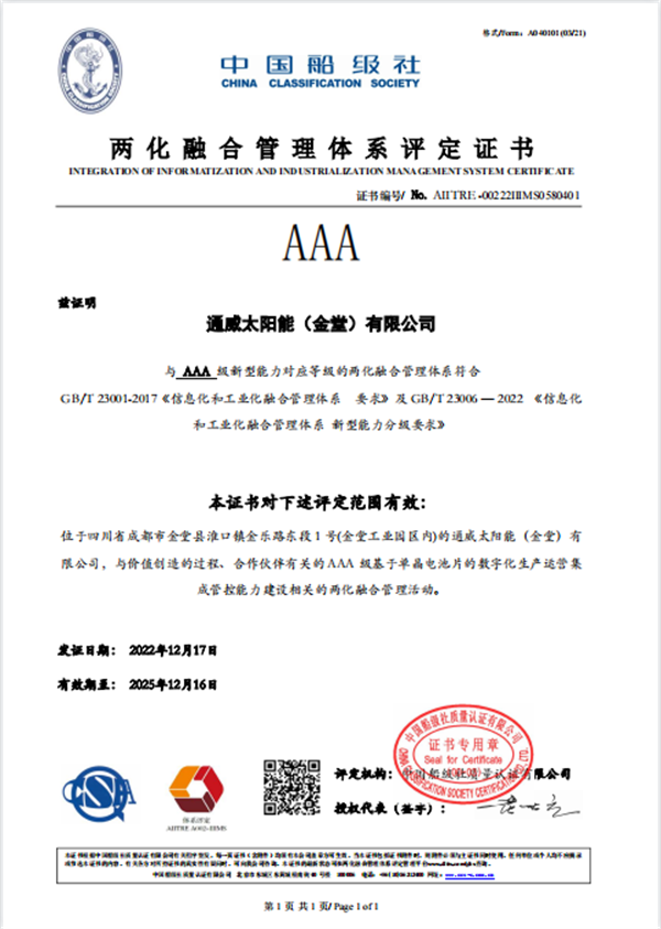通威太陽能金堂基地順利通過國家兩化融合管理體系貫標AAA級評定