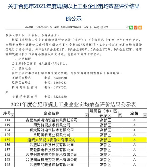 通威太陽能(安徽)有限公司榮獲合肥市規(guī)上工業(yè)畝均效益評價A類企業(yè)
