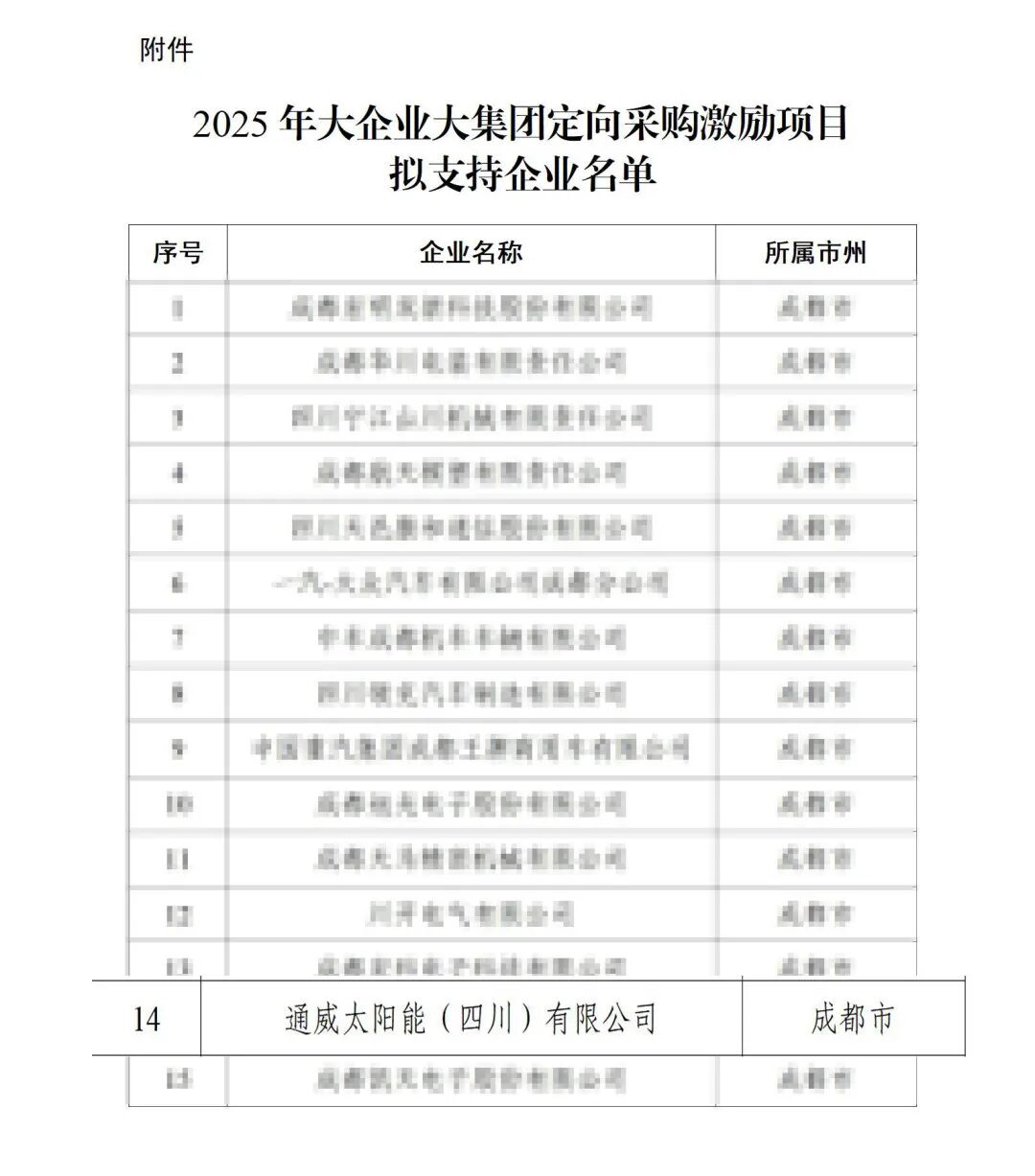 通威太陽能科技金堂基地順利入選2025年大企業(yè)大集團定向采購激勵項目支持企業(yè)名單