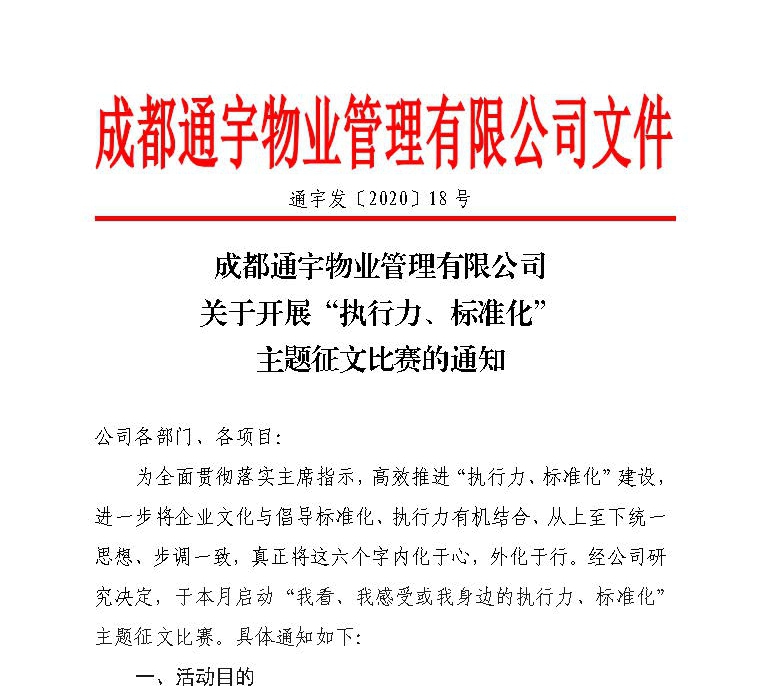 通宇物業(yè)“我看執(zhí)行力、標準化” 主題征文比賽火熱啟動
