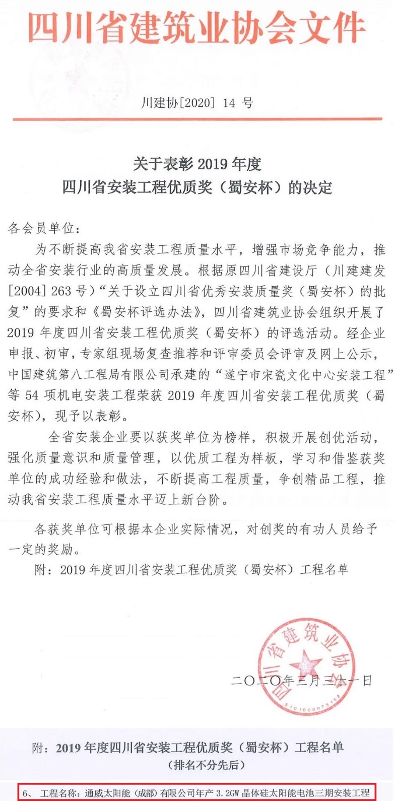 通威太陽能成都公司三期項目榮獲四川省安裝行業質量最高榮譽獎“蜀安杯”