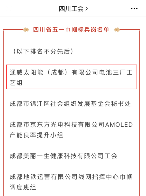 通威太陽能成都公司電池三廠工藝組榮獲“四川省五一巾幗標兵崗”榮譽稱號