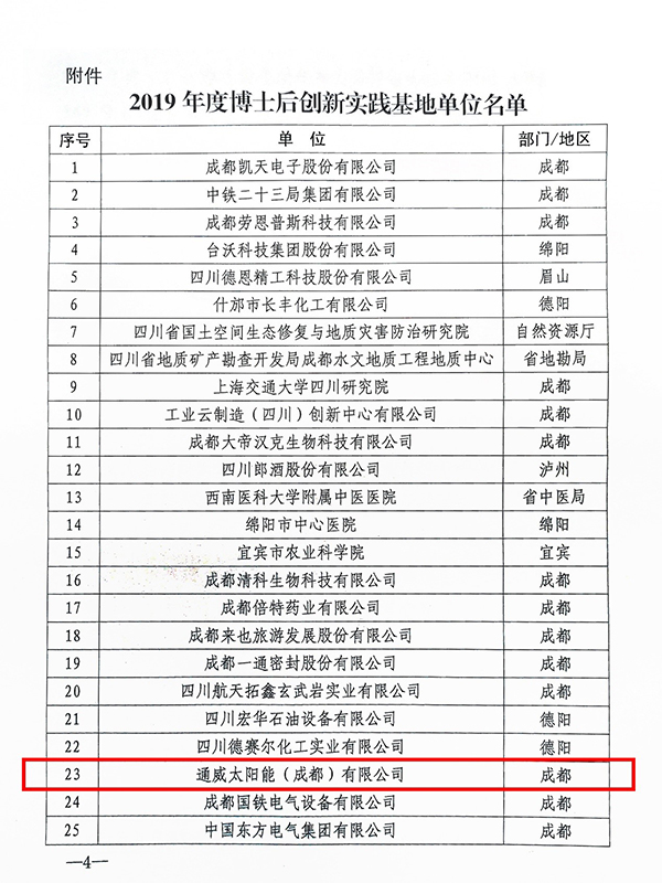 通威太陽能成都公司成功入選“2019年四川省博士后創(chuàng)新實(shí)踐基地”