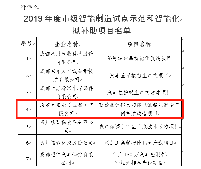 通威太陽能入列成都智能制造試點示范和智能化擬補助項目名單