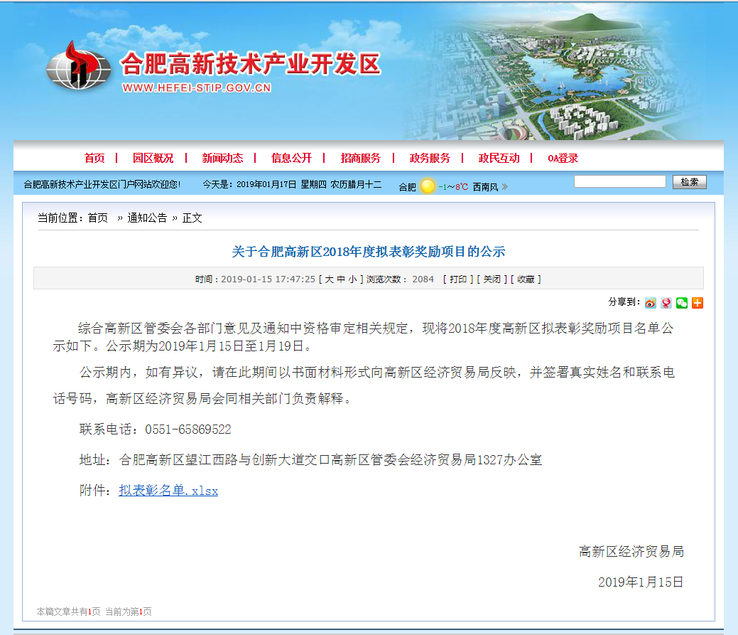 通威太陽能合肥公司榮列“合肥高新區2018年度擬表彰獎勵項目” 6項獎項公示名單