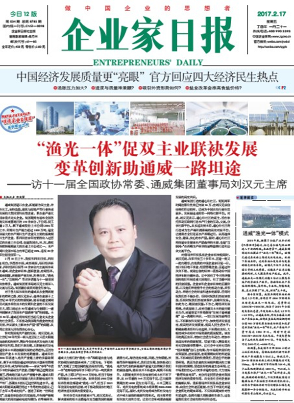 企業(yè)家日?qǐng)?bào):“漁光一體”促雙主業(yè)聯(lián)袂發(fā)展 變革創(chuàng)新助通威一路坦途