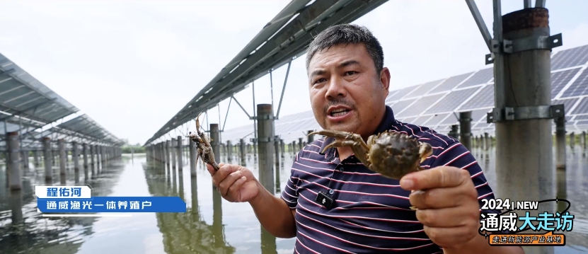 我們不知道第一個吃螃蟹的人是誰,但第一個吃到“蟹光一體”大閘蟹“甜頭”的人,那一定是程佑河。作為龍袍區的養蟹大戶,程佑河與水產養殖打了30多年的交道,熟稔養蟹的每個環節,被當地人稱為養蟹的一把好手。今年,是他與通威合作的第14年。2014年,程佑河到通威大學學習時,恰逢劉漢元主席給大家講授通威“漁光一體”課程,自此便與通威“漁光一體”模式“結緣”。從龍袍“漁光一體”基地項目開始,他就積極參與,并跟隨通威水產專家進行大閘蟹試養,并總結出了“漁光種好草,好草凈好水,好水養好蟹”的“蟹光一體”養殖經驗。