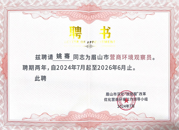 此次姚總被聘為“眉山市營商環境觀察員”,將進一步促進政企之間的溝通與合作,共同推動眉山市營商環境的持續優化和提升。未來,通威太陽能(眉山)有限公司將持續把“降本增效”理念融入公司的各項工作之中,同時積極參與眉山的高質量發展示范工作,共同為眉山的繁榮和發展作出更大的貢獻。