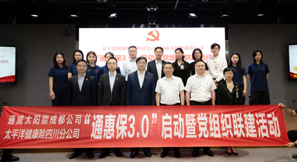 5月22日,太平洋健康保險股份有限公司四川分公司與通威太陽能(成都)有限公司共同舉辦的“通惠保3.0”啟動儀式暨黨組織聯(lián)建活動在通威太陽能隆重舉行。太平洋健康險黨委委員、副總經(jīng)理宋全華,太平洋健康險四川分公司黨支部書記、總經(jīng)理陳裕豐,太平洋健康險四川分公司副總經(jīng)理趙慶鋒,通威太陽能總經(jīng)理周華,通威集團黨委委員、通威股份人力資源總監(jiān)易繼成,通威太陽能副總經(jīng)理、成都公司黨委書記王耀頤出席活動,雙方相關業(yè)務部門負責人及員工代表參加活動,共同見證雙方在保險業(yè)務、黨建聯(lián)建開啟深化合作新篇章。
