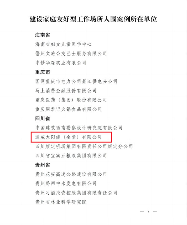 通威太陽能(金堂)有限公司入圍全國建設家庭友好型工作場所典型案例