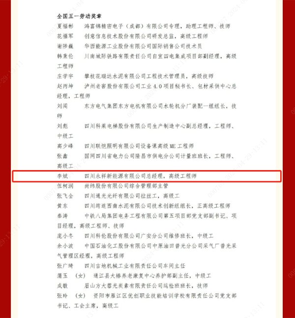 永祥光伏科技單晶制造副工段長李英獲四川省五一勞動獎章;